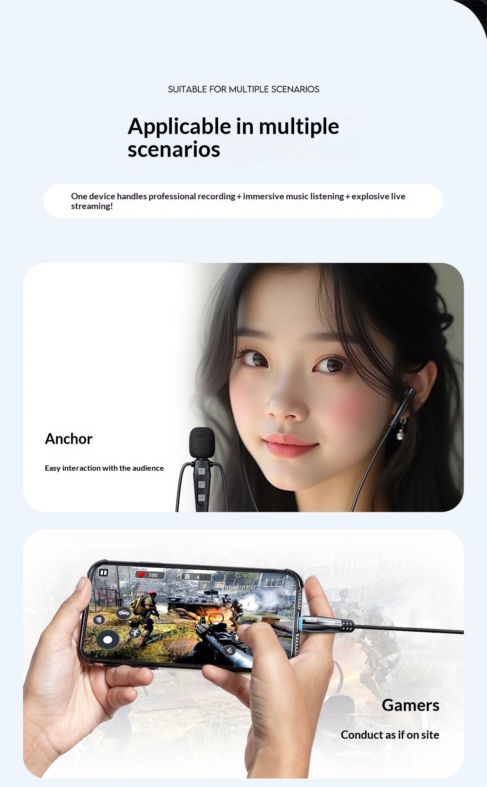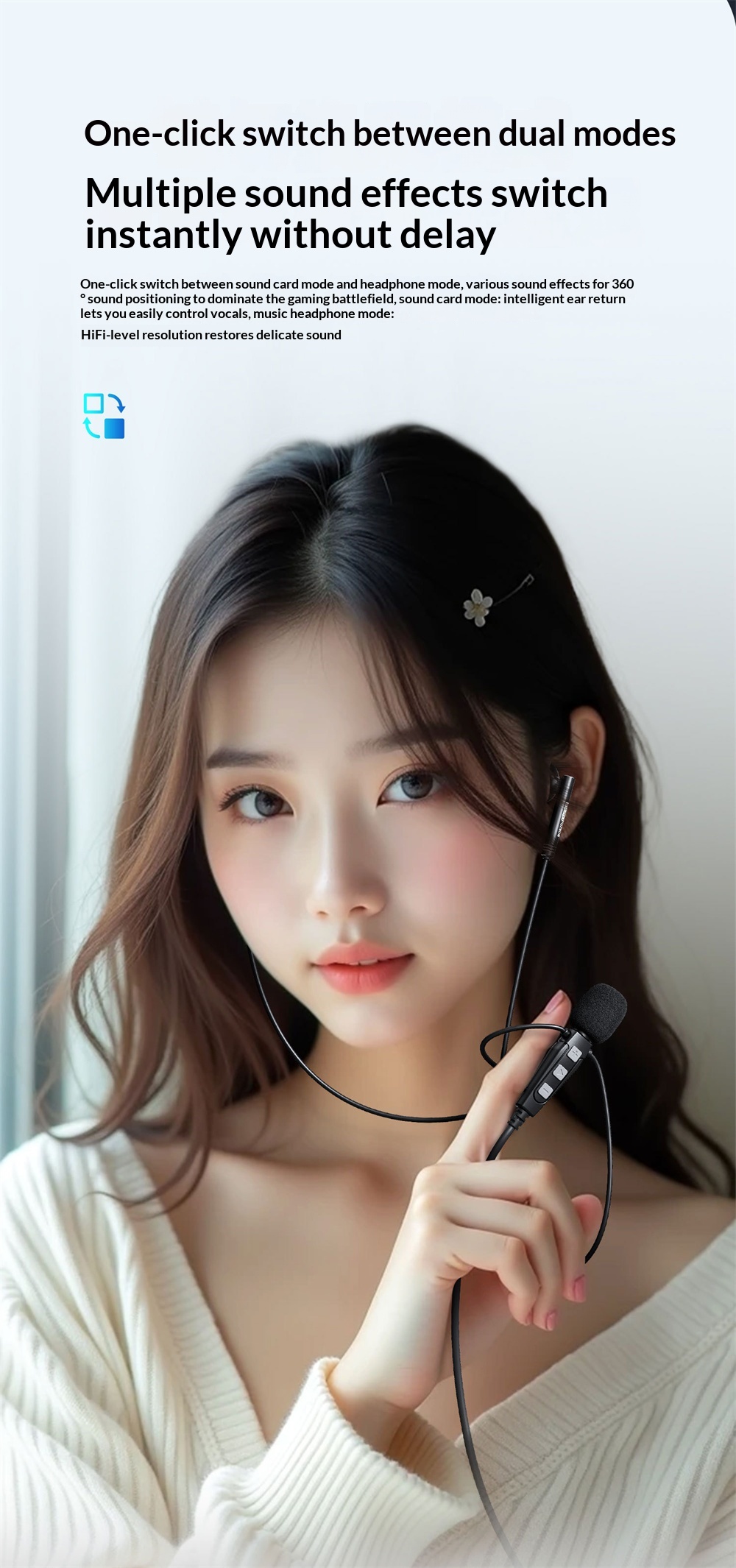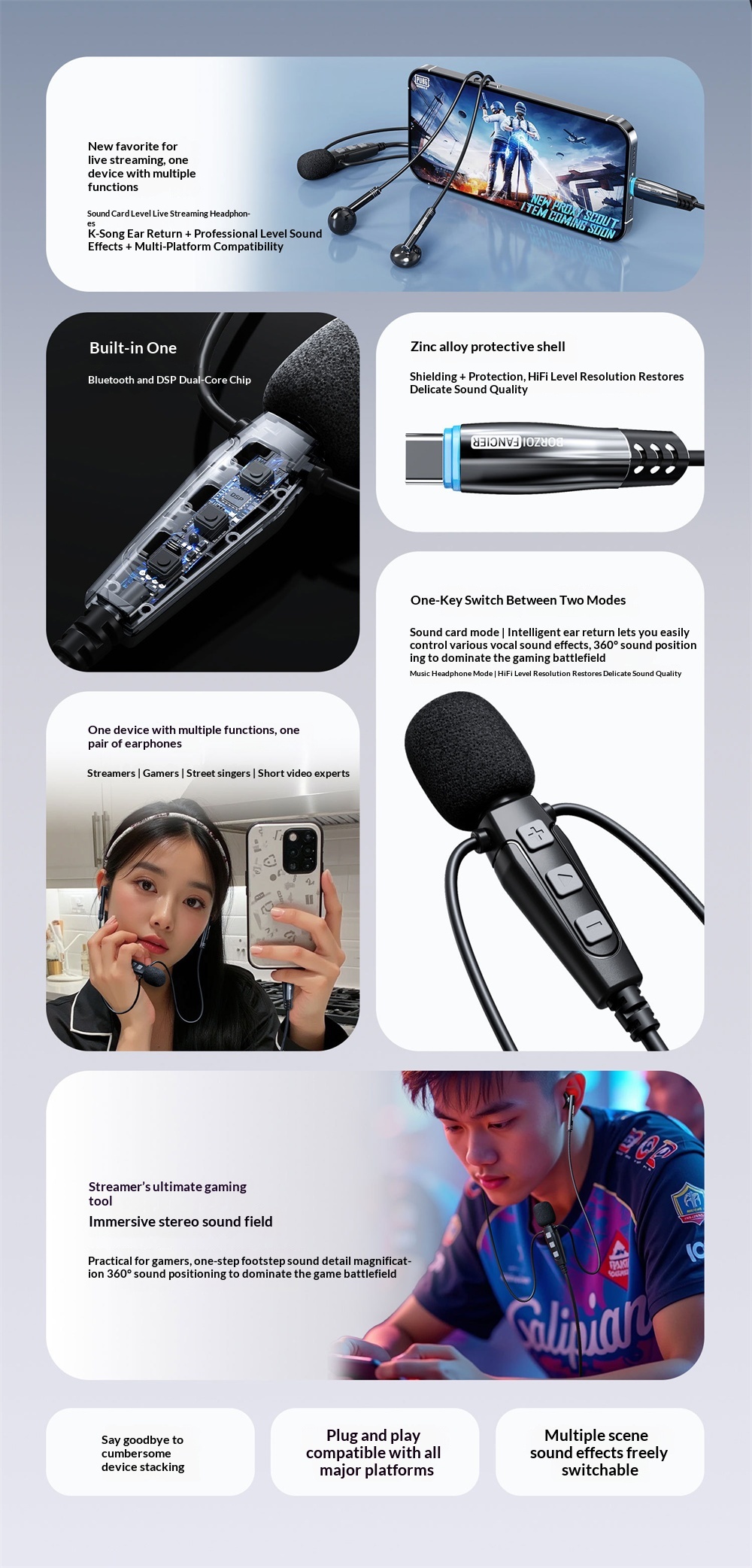 2. Multimode Functionality: Switch seamlessly between earphone mode and sound card mode for KTV, live streaming, gaming, and conferencing.