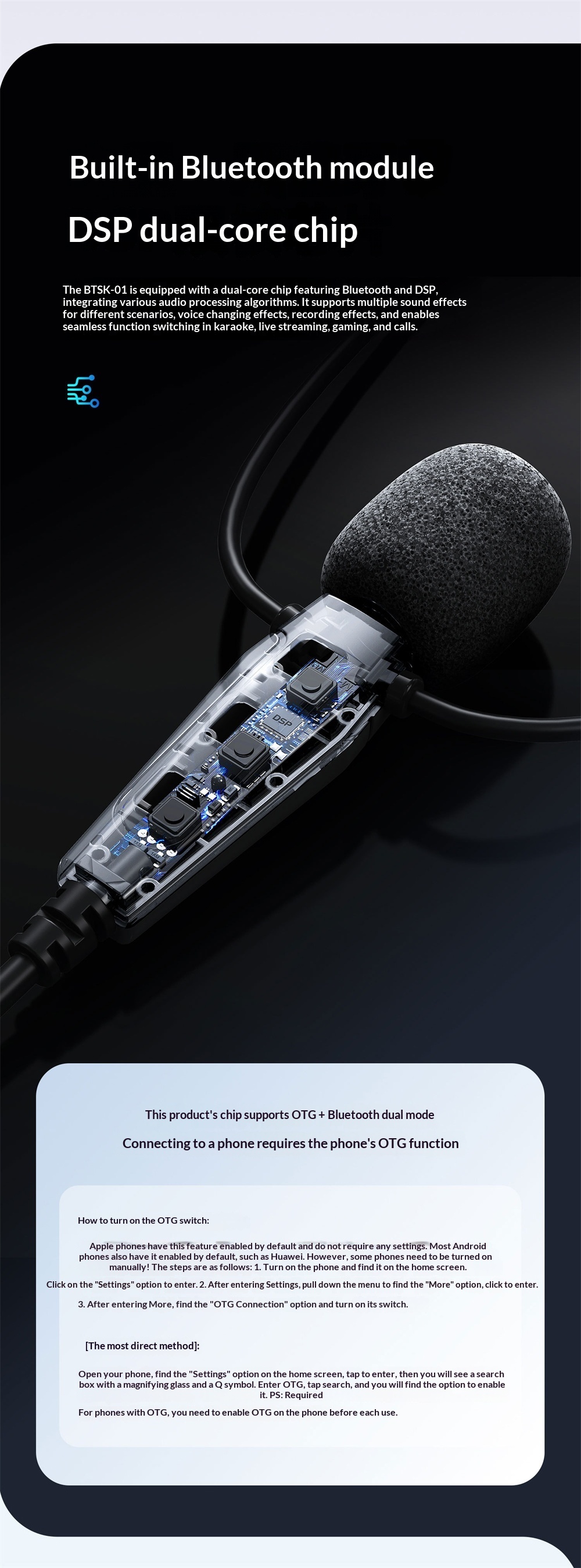 1. Dual DSP Chipset: Equipped with bluetooth and DSP dual-core for sound effect processing across voice modes, music, recording, and voice-changing features.
