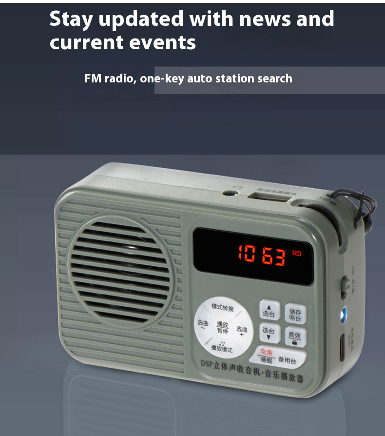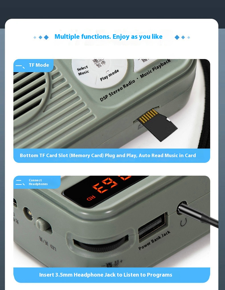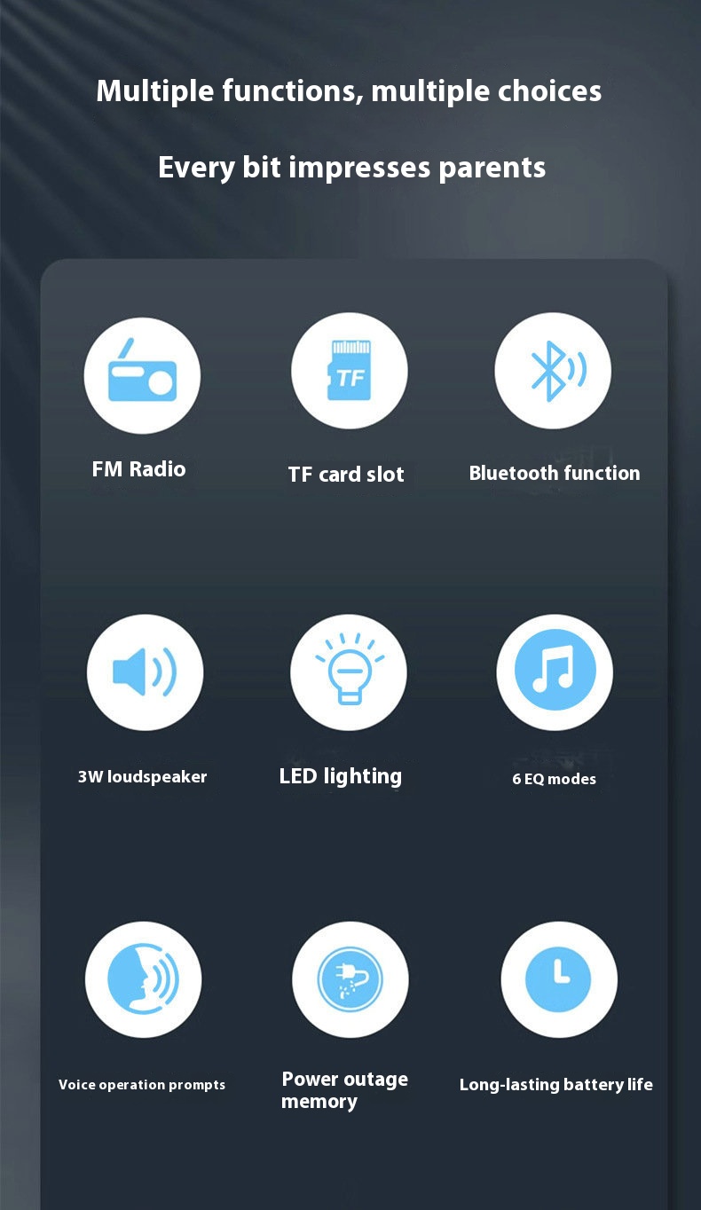 1. Multiple Functionality: Supports FM radio, bluetooth connectivity, and TF card playback.