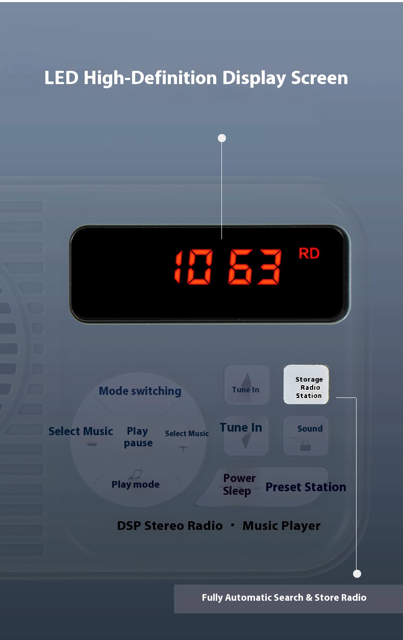 2. High-Definition Display: LED screen showing clear frequency and station information.